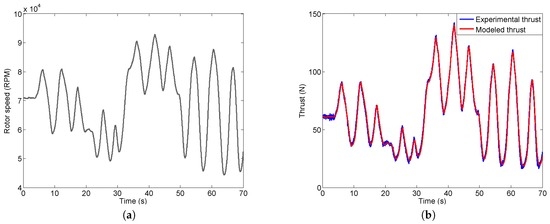 For real problems, the engines typically operate with time-varying rotor speed, especially during the takeoff and landing stages. Therefore, the polynomial thrust model needs to be validated by a dynamic thrust experiment as well. The time-varying rotor speed as shown in Figure 8a is used in the dynamic experiment. The range for this time-varying rotor speed is from 45,000 to 95,000 RPM which covers the rotor speed for UAV takeoff and landing. The corresponding thrust computed using the polynomial model is then compared with the thrust measured during the experiment in Figure 8b. A close match is observed which again confirms the accuracy and effectiveness of the thrust model.
