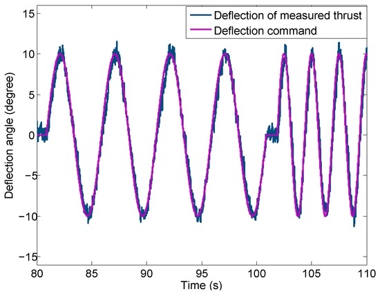The actual thrust deflection angle () derived from the thrust vector measurement using Equation (7) is compared with the deflection command in Figure 9 using the blue curve. A close match between the two curves is observed. This suggests that the deflection command can be used as the actual thrust deflection angle with sufficient accuracy. Therefore, the thrust vector model can be written as: