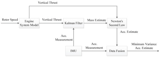 The flowchart of the noise reduction procedure developed in this work is shown in Figure 10. At first, the engine system model (including engine thrust model and thrust vector model in Section 4) needs to be built. It is used to obtain the UAV vertical thrust when it is in flight. Then the Kalman filter (Equation (16)) is applied to estimate UAV mass by combining the information of engine vertical thrust and the IMU measured acceleration. The estimated UAV mass can then be used together with the vertical thrust to compute acceleration using Newton’s Second Law. A data fusion step (Equation (22)) is finally applied to obtain the minimum variance estimate of the UAV acceleration. This overall procedure can be used for any type of UAVs for noise reduction purpose. The only change will be in the engine system model if the method is applied to different UAV platforms.