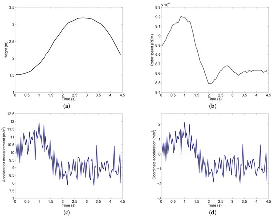 Experiment results. (a) Experiment height measurement; (b) Experiment rotor speed; (c) Experiment acceleration measurement; (d) Coordinate acceleration (computed from Figure 11c).