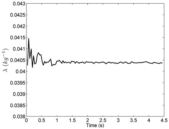 We apply the engine thrust model and thrust vector model developed in Section 3 to the experimental data. The calculated vertical thrust is shown in Figure 12. It is then used to estimate λ using the Kalman filter (Equation (16)). As shown in Figure 13, the value of λ quickly converges to 0.0404 kg, which means that the mass of the UAV (1/λ) is about 24.75 kg. Note that, the variable λ is unknown during flight, though it can be considered as a constant within a short period of time (for example, during the takeoff and landing stages). This is because that the UAV mass is impacted by the fuel consumption, which is unknown when the UAV is flying. Therefore, the Kalman filter (Equation (16)) is required to estimate λ.
