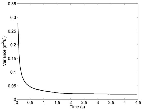 The final acceleration fusion result is shown in Figure 14 as the red line. For comparison purpose, the measured vertical acceleration is shown again in Figure 14. It can be seen clearly that the acceleration fusion result suppresses the noise in the measured acceleration and meanwhile preserves the trend in measurements. To quantify that, we calculate the variance of the acceleration computed with data fusion method using Equation (23). The variance is shown in Figure 15. Initially the variance is of similar magnitude as the variance of the measured acceleration (as shown in Table 1). It drops quickly as more data is used in the fusion calculation and becomes stable at a value close to 0.02 m/s after about 2 s.