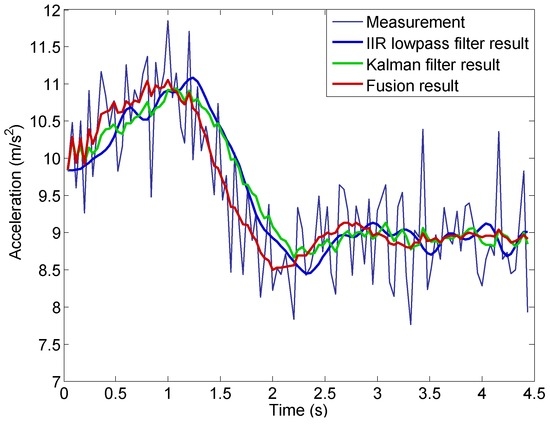For the purpose of comparison, an infinite impulse response (IIR) lowpass filter developed in [9] and the Kalman filter developed in [13] are also used to denoise the measured acceleration. The parameters of the IIR filter and the Kalman filter are adopted to achieve similar denoising performance to the data fusion method developed in this work.
