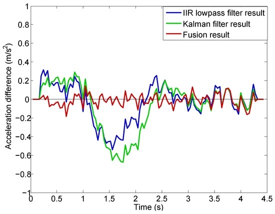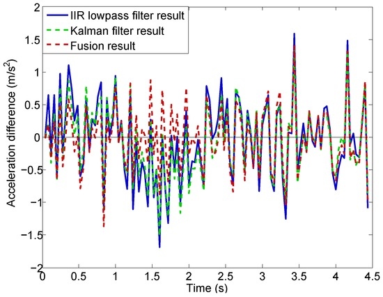 where is the computed acceleration, and is the measured acceleration. The acceleration differences are shown in Figure 17. Dashed lines are used for Kalman filter and data fusion results for better visualization. We can see that the acceleration differences are of high amplitude due to the significant noise in the measured acceleration.