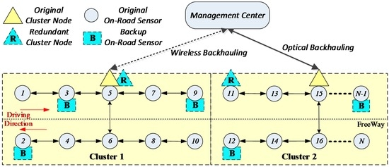 The on-road sensors need to transmit many kinds of traffic information to the management center and receive control signals from the management center along the opposite path, so the communication is two-way. The topology of the on-road sensor network is linear, while the topology of on-road sensors with cluster heads and the management center is star style. In this paper, we assume that all the on-road sensors can be synchronized by the management center and have no security problems. Hence, we mainly focus on improving the wireless communication reliability by a fault-tolerant mechanism, which concerns whether the on-road sensors can normally communicate with the management center in this topology.