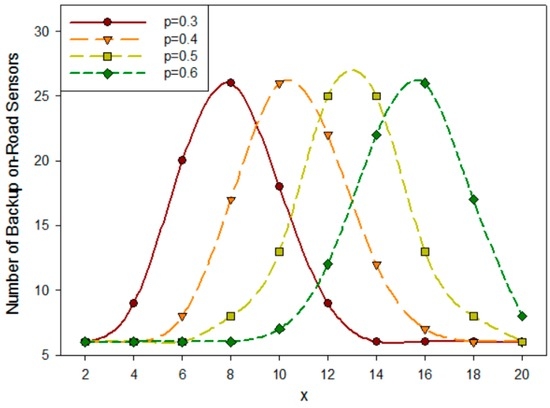 In our theory, the deployment of backup on-road sensors should consider the constraint of the N − x principle. Figure 12 illustrates the relation between x in the N − x principle and the deployment cost of backup nodes, when there are various numbers of on-road sensors in a cluster. The deployment cost can be represented by the number of backup sensors in the system if they possess the same . This figure implies that the deployment cost of backup nodes increases as the x in the N − x principle increases while the total number of the on-road sensors is fixed. This trend is consistent with the conclusion drawn in Figure 4 when . While x is fixed, the deployment cost of backup nodes firstly increases and then decreases with the increase of the total number of the on-road sensors . This trend coincides with the characteristic of binomial distribution that represents the fault probability. According to the N − x principle, in a cluster of on-road sensors, when there are x failed nodes, the system will not be affected. When is small, the number of backup sensors is small because of the small system scale. The number of backup sensors increases with the growth of system scale , and as a result the cost increases too. However, when gets larger and larger, the system scale becomes large enough. It will be easier to meet the N − x principle so the number of backup sensors becomes less and less and correspondingly as a result the deployment cost is reduced. Therefore, when is fixed, the cost will first increase and then decrease. Moreover, the larger the is, the more obvious the trend will be. This implies that we can establish a reasonable N − x principle in terms of system scale. To simplify the analysis, we use the N − 1 principle in the following simulation.