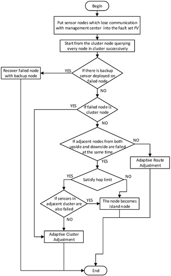 - Redwan, H.; Akele, G.; Kim, K.H. Cluster-based failure detection and recovery scheme in wireless sensor network. In Proceedings of the 2014 Sixth International Conference on Ubiquitous and Future Networks (ICUFN), Shanghai, China, 8–11 July 2014; pp. 407–412.