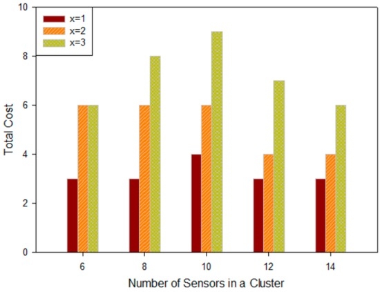 Relationship between number of sensors in a cluster and deployment cost.