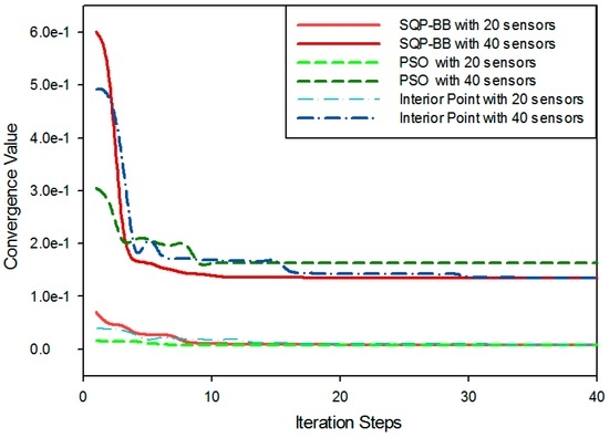 Before the results discussion, we firstly verify the performance for the proposed solving algorithm. The scale of the simulation scene is one cluster with 20 or 40 on-road sensors. We present the computational results for solving the proposed deployment problem by SQP with BB used by our paper, Interior Point Method with BB, and Particle Swarm Optimization (PSO) algorithm that represents the kind of intelligent optimization algorithms. The convergence performance results of the three algorithms are compared, as shown in Figure 13.