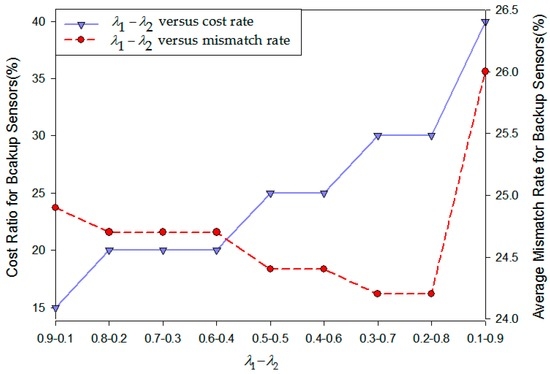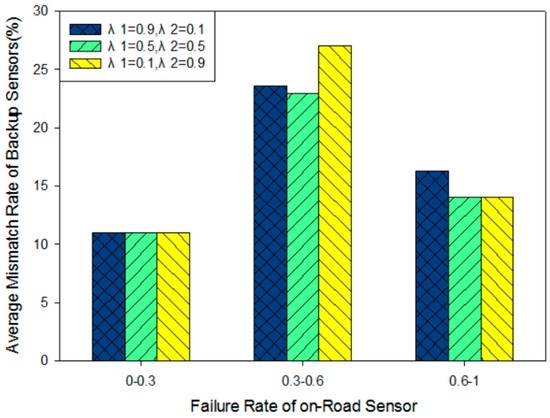 Combining the above analysis, intermediary values of λ1 and λ2 can make our model achieve both aspects of the balance of cost and fault probability. For on-road sensors with higher failure probability, the deployment method basically guarantees the coverage of the backup nodes and it could be not too sensitive to cost. For the ones with lower failure probability, the model ensures that there will not be waste in the backup sensor deployment. The number of backup on-road sensors is extremely close to the number of actually failed sensors and hence the mismatch rate performance is the lowest for each case. Consequently, when λ1 = 0.5 and λ2 = 0.5 in the model, the system can achieve a good balance between reliability and cost. This is consistent with the conclusion in Figure 14.