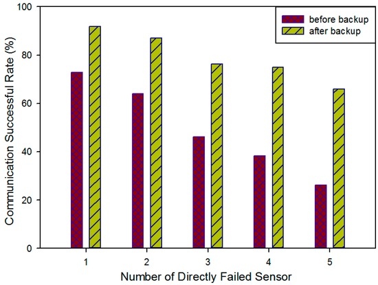 As shown in this figure, the purple columns represent the network communication success rate when there are a couple of physically failed sensors, the yellow columns represent the network communication success rate after recovery with deployed backup sensors. It can be seen that the awakening backup sensors can effectively increase the communication success rate and as a result restore the system’s normal communication. Our method can basically address the communication reliability problem by awakening backup sensors in the corresponding position, however, limited by the deployment cost, the on-road sensor’s backup work cannot recover all the failed communication sensors, especially when the number of physically damaged sensors is large. Hence with the increase of the number of physically failed sensors in the system, the network communication success rate decreases whether before or after backup sensor recovery. As a result, more physically failed sensors in a system will reduce the recovery effect of backup sensors, so it will be necessary to recover effective system communication with route adjustment and cluster adjustment.