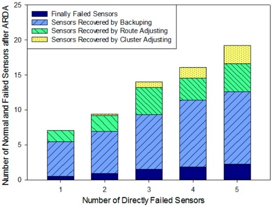 The network recovery ability is shown in Figure 17. Firstly, the average number of failed sensors increases with the increase of the number of directly failed sensors. Without any hop restriction on QoS, almost all the failed sensors can be recovered by backup sensor nodes, route adjustment and cluster adjustment. When the number of physically failed on-road sensors are 1, 2, 3, 4 and 5, the proposed fault-tolerance mechanism can recover 92.8%, 90.4%, 89.2%, 88.6% and 88.3% of the failed on-road sensors, respectively. The average recovery rate reaches 89.9%, which ensures a good fault-tolerance performance for different failure cases. It is also shown that the failed sensors recovered by direct backup account for the largest proportion of the total recovered sensors, and route adjustment manner gives the second largest amount. In particular, when there is only one directly failed sensor in the cluster, the failed sensors can be completely recovered by backup on-road sensors and route adjustment. With the increase in the number of directly failed nodes, the proportion of cluster adjustment gradually increases, while at the same time, the number of remaining failed nodes after the ADR protocol adjustment increases too. These nodes are comprised of directly failed sensors and island sensors.