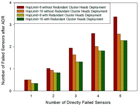 Firstly, Figure 19 shows that in the scenario without redundant cluster head deployment, if there are more physically failed sensors, there will be more sensors losing communication with the management center in the system, while at the same time, the more stringent the hops constraint is, the more remaining failed sensors are left after ADR adjustment. This is because with the increase of the number of failed sensors, cluster adjustments become more and more frequent. The strict hops limit places restrictions on the sensors’ communication, which makes them unrecoverable by cluster adjustment and this causes more island nodes.
