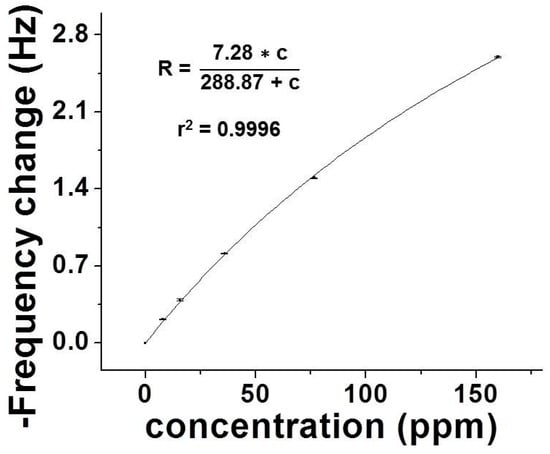 Figure 2 shows a calibration curve of the new VOC device with a MIP-QTF sensor using the above-described setup. The calibration curve represents the sensor signal frequency change in presence of the sample vs. the absence of the sample (clean air baseline) under different concentrations of gas samples, including 0 ppm (clean air), 7.9 ppm, 15.8 ppm, 36 ppm, 76.5 ppm, and 160 ppm of o-xylene. o-xylene was chosen as model analyte to evaluate performance due to the abundance in traffic scenarios. The diluted samples were prepared in laminated bags with clean and dry air balance. All air sample concentrations were also monitored using PID as reference. The calibration curve is fitted to Langmuir adsorption isotherm, which is described by a relationship between the sensor response and analyte concentration with a fitting squared-regression coefficients (r2) close to 1.