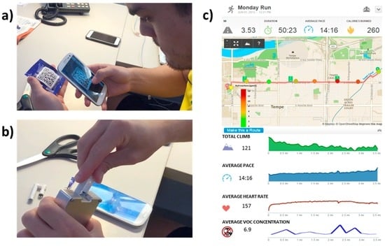 (a) Scanning sensor QR code; (b) Replacement of new sensor cartridge; (c) Real-time fitness and VOCs exposure device data during personal exercise.