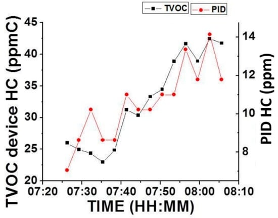 The photo-ionization detector (PID) is a popular portable device for detecting volatile compounds by ionizing VOC molecules using a UV lamp []. In order to compare against current technology, a simultaneous test of the new VOC device with a PID was run with both devices placed inside a vehicle traveling along Los Angeles Highway 101 for ~40 min. The new VOC device gave a concentration value every three minutes. The PID monitor reading was also recorded at the same time. Figure 4 shows the response comparison between the new VOC device and the PID monitor. The scenario chosen to determine the total hydrocarbon concentration with the new VOC device was “outdoor environment with motor vehicle exhaust” distribution []. On the other hand, for the PID monitor, the correction factor for a mixture (CFmix) was calculated according to the PID manual, which indicates to use the sum of the mole fractions Xi of each component divided by their PID’s respective correction factors CFi as follows: