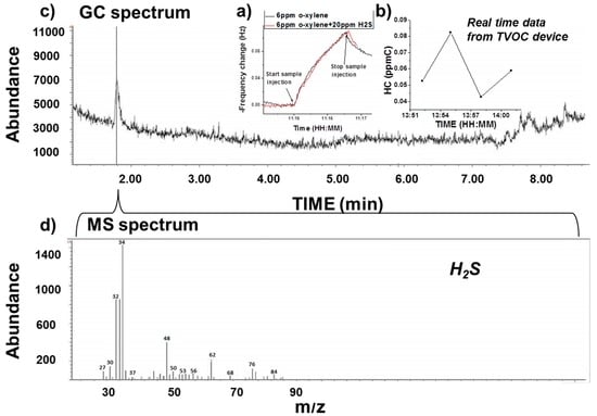 Due to the nature of sensing material (MIP), MIP-QTF sensors are able to detect analytes in the hydrocarbon chemical family. In order to probe the selectivity of the sensors, an environment with a dominant single gas was chosen for field-testing, and the ambient air at Mammoth Spring, Yellowstone National Park was tested. Real-time concentrations with the new VOC device were assessed while air samples were collected for GC-MS analysis in the laboratory later. Figure 5 summarizes the results. Artificial gas sample was tested in the lab to show that the sensor can selectively respond to hydrocarbons in the presence of H2S. As shown in Figure 5a, response to 6 ppm o-xylene was recorded in the presence and absence of 20 ppm H2S. There was no significant change in response with the addition of H2S, confirming that the VOC device’s sensor is immune to H2S. Results of real-time hydrocarbon concentration from the new VOC device (Figure 5b) and analysis from GC-MS (Figure 5c,d) are compared. The hydrocarbon concentration given from the new VOC device was close to 0, indicating a low hydrocarbon concentration in the environment. However, the GC-MS analysis indicated the presence of a single strong peak of H2S (at 1.8 min in the gas spectrum). Although a quantitative analysis was not conducted (e.g., calibration curve on GC-MS), this qualitative result provides evidence of selectivity of the VOC device with MIP-QTF sensors in highly enriched H2S environments.