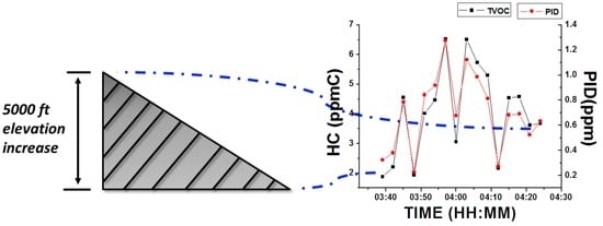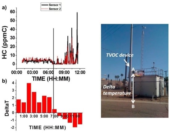 Figure 8b shows the temperature difference between point A (roof temperature) and point B (ground temperature) vs. time. A change of the temperature difference from positive to negative at ~7:00 a.m., known as inversion temperature, is shown in Figure 8b, and an obvious drop of HC concentration in the profile at the same time (~7:00 a.m.) is shown in Figure 8a. When the difference between roof temperature and ground temperature is changing from positive to negative, a well-known natural convection phenomenon occurs [], leading to a dilution of pollutants in the air. This is expected to reduce the concentration of hydrocarbon, and was reflected as a transitory decay of HC concentration reading from the VOC device. This result shows the effectiveness of the VOC device to capture real-time HC concentrations due to environmental changing conditions such as temperature.