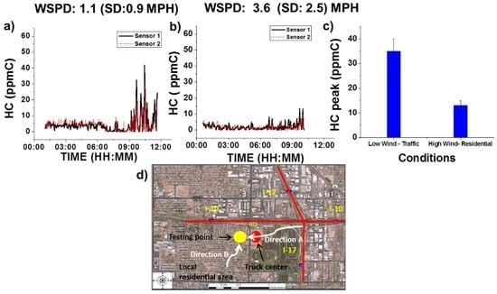 Similar to the cases described in Section 3.2.3 and Section 3.3.1, both Figure 9a,b shows a relatively low HC concentration from 00:00 a.m. to 07:00 a.m. due to the light traffic and low activity level. However, a significant difference is observed in the time window from 07:00 a.m. to 10:00 a.m., with the case shown in Figure 9a having a much higher level of HC concentration than the case shown in Figure 9b. Since the two testing days were normal business days, traffic conditions on each day were expected to be similar. However, the HC concentration profiles (Figure 9a,b) and peak HC concentration values (Figure 9c) on the two days were significantly different. This result suggests that higher HC concentration levels were associated with lower wind speed and wind direction from areas with higher traffic such as a local truck center and highway. Likewise, higher wind speed and wind direction from cleaner locations had a lower expected HC concentration.