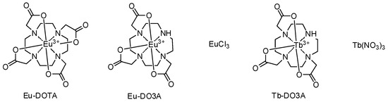 - Richardson, F.S. Terbium(III) and europium(III) ions as luminescent probes and stains for biomolecular systems. Chem. Rev. 1982, 82, 541–552. [Google Scholar] [CrossRef]