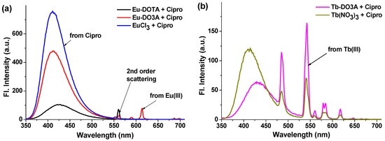 Emission behaviors of (a) Eu3+ and (b) Tb3+ complexes upon addition of Cipro. The emission spectra were collected immediately after addition of Cipro (10 µM) to a solution of each metal species (10 µM) in HEPES buffer (pH = 7.4), under excitation at 278 nm.