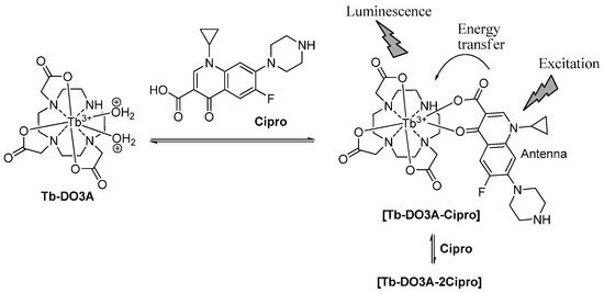Ciprofloxacin, a fluoroquinolone antibiotic, is widely used for the treatment of bacterial infection in humans due to its broad antibacterial spectrum. An excessive use or overdose of ciprofloxacin on the other hand can cause several adverse effects not only to humans but also to microorganisms. Unabsorbed ciprofloxacin in the body is mostly excreted through urine and finally goes to the environment, providing a drug resistance pressure on bacteria. Hence a simple and efficient detection method of ciprofloxacin is necessary, which, for example, can be used to analyze ciprofloxacin content in urine. Although ciprofloxacin itself shows inherent fluorescence, direct fluorescent detection of ciprofloxacin in raw urine sample is difficult due to autofluorescence of urine by other components. Herein we report that a Tb(III) complex of DO3A (1,4,7,10-tetraazacyclododecane-1,4,7-triacetic acid) can be efficiently sensitized by ciprofloxacin to emit luminescence separately from the urine autofluorescence wavelength region. Tb-DO3A shows excellent sensitivity with a detection limit of three parts per billion in aqueous buffer solution. Further, Tb-DO3A is used to detect ciprofloxacin with high sensitivity and selectivity in a raw urine sample without any purification or separation procedures in the concentrations ranging from 1 µg·mL−1 to 50 µg·mL−1. The direct measurement of ciprofloxacin excreted in urine may be used to control overdose of the drug.