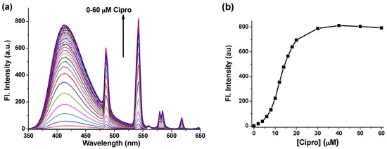 (a) Emission changes of Tb-DO3A (10 µM) with the increasing concentrations of Cipro (0–60 µM) in HEPES buffer (pH = 7.4); (b) Plot of terbium emission intensity at 542 nm vs. Cipro concentration. The spectra were recorded after excitation at 278 nm.