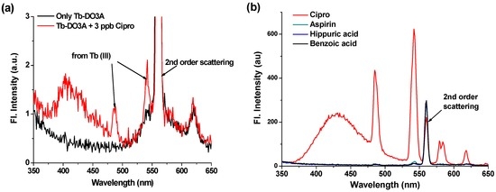 (a) Emission changes of Tb-DO3A (5 μM) upon addition of Cipro (3 ppb). The fluorescence data were obtained by excitation at 278 nm in HEPES buffer (pH = 7.4). This data shows a signal-to-background ratio of more than three. (b) Selective luminescence response of Tb-DO3A (10 µM) towards Cipro over other analytes possibly present in urine, such as aspirin, hippuric acid, and benzoic acid. Each of the analytes was added at a concentration of 20 µM in HEPES Buffer (pH = 7.4). The spectra were recorded under excitation at 278 nm.