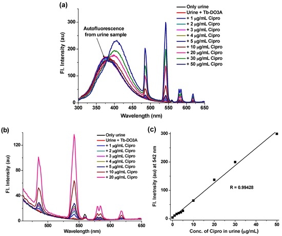 Finally, we applied Tb-DO3A for the detection of Cipro in intact urine. To this end, urine from a healthy volunteer was collected. The raw urine was diluted 10-times by adding DI water. Without any other pretreatment, the diluted urine was directly used for the fluorimetric assay. Tb-DO3A was added to a fixed volume of the diluted urine (2.5 mL) to make a final concentration of Tb-DO3A at 20 µM. Then Cipro was spiked to that solution at various concentrations, ranging from 1 µg·mL−1 to 50 µg·mL−1, with respect to the actual raw urine. It has been observed that urine itself shows strong autofluorescence in the wavelength region of 300–475 nm, which remains merged with the native fluorescence of Cipro (Figure 6a). This auto-fluorescence of urine samples is likely to be originated from the amino acids, proteins and biomolecules present in the raw urine sample [33]. To remove this interfering autofluorescence, most of the previous detection protocols based on Cipro’s native fluorescence were performed after laborious sample preparation steps to remove those biomolecules and proteins from urine [13,14,17,18,19,20,21,23,24]. Hence, those methods are not applicable to direct fluorimetric measurement for biological samples. On the contrary, we can conduct the Cipro detection without any sample preparation steps, as the sensitized luminescence of Tb-DO3A shows distinct emission peaks only in the presence of Cipro with little interference from other urine components (Figure 6a). Although the native fluorescence of Cipro was completely buried under the auto-fluorescence of urine, still the strong terbium luminescence peak at 542 nm (which is away from the urine auto-fluorescence region) was clearly observed upon treatment with Tb-DO3A even in the lower concentration range of Cipro (<10 mg·mL−1) (Figure 6b). The terbium luminescence increases linearly with the concentration of Cipro (Figure 6c), which would provide a convenient way to determine the unknown concentration of Cipro in urine samples. According to reported data, after oral administration of a Cipro tablet (250 mg) by a healthy human, the minimum amount of intact Cipro excreted through urine is ~4 µg·mL−1, which is dependent on the time and day of dose [27]. Our luminescence detection method using Tb-DO3A shows high sensitivity even in a raw urine sample; hence, it is suitable for the detection of such a low level of Cipro.
