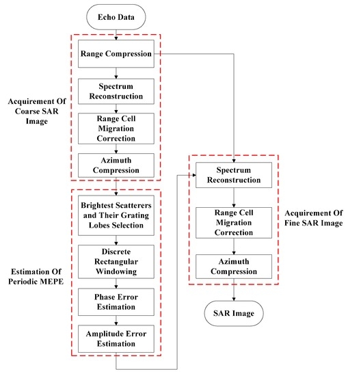 Finally, the estimated MEPE are compensated during the spectrum reconstruction operation, and the fine SAR image with range grating lobes suppressed is achieved by conventional imaging algorithms. The flowchart of the proposed GLS method is shown in Figure 1.