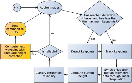 Differently from these approaches, our approach consists of developing a methodology to perform height estimation, specifically designed for terrain following flights. Other contributions are estimation reliability classification through decision trees and the consideration of the vehicle vertical displacement in the optical flow computation. Given the adoption of COTS hardware, we had to use a gimbal-stabilized camera, since the image sensor features a running shutter, which would make it impossible to digitally stabilize the image or use it to estimate the translational optical flow through de-rotation techniques.