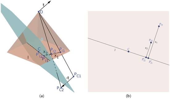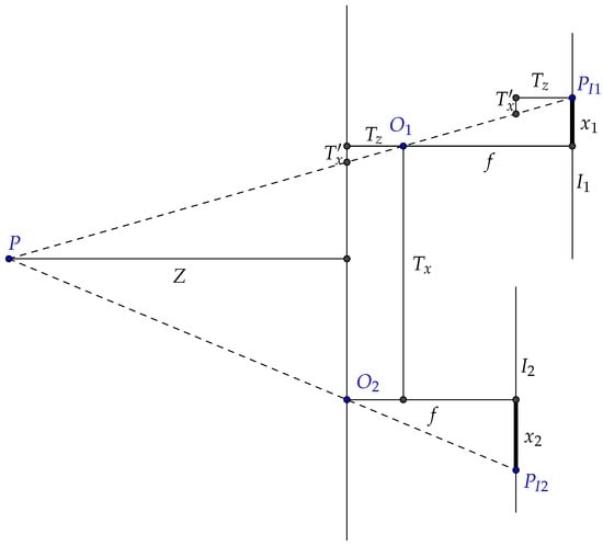 where f is the focal length, and are the translations in the x and z axes, and are the distances from the projected points to the principal point and to a projected compliment of the translation along the x axis, which is computed as: