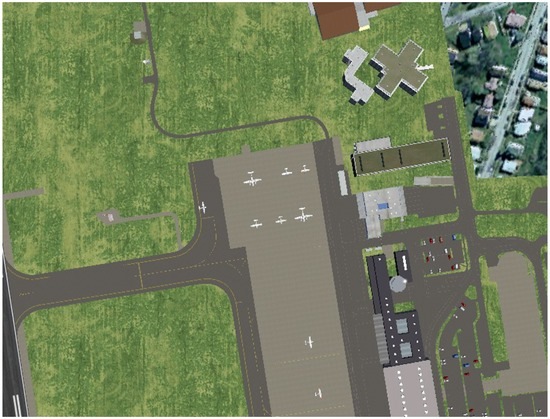 Furthermore, the FlightGear Flight Simulator presents the advantage of using 3D models, satellite imagery and custom textures to render a scenario based on a mesh created from the elevation databases. Furthermore, it is open source, which allows changes in several parameters. For example, it is possible to set the camera positioning, simulating the behavior of biaxial or triaxial gimbals. A sample picture is shown in Figure 4.