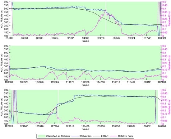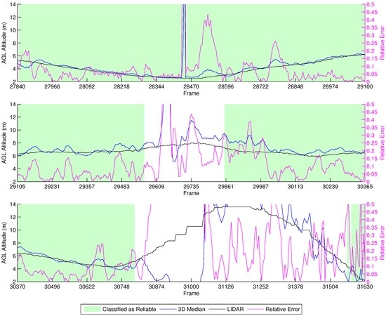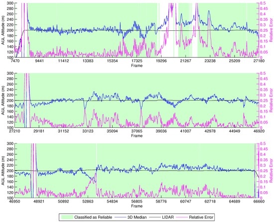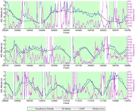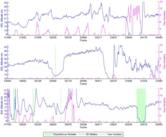 Unfortunately, our reliability classifier was trained with data from real flights executed at an AGL below 12 m. Because of this, most of the estimations were classified as not reliable, since the decision tree was not trained to correctly classify images acquired from such heights. Around Frames 60,417–60,600, the vehicle flies closely over a tree, and the height estimation drops below 11 m. In this situation, we observe that the classifier identifies these as reliable estimations.