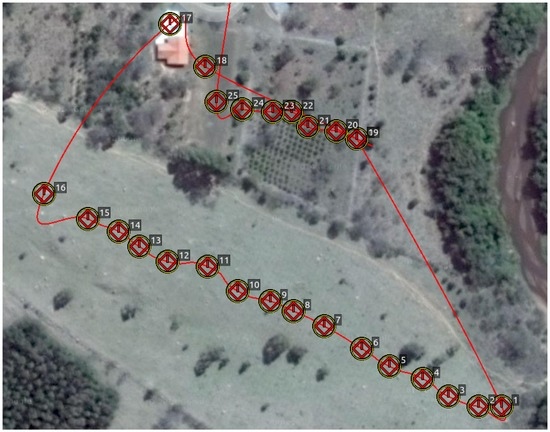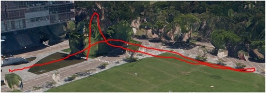 In this experiment, we established a ground truth by logging the projection on the terrain of the desired flight path through a mobile phone GPS application and adjusting the waypoints accordingly to keep the UAV at a fixed AGL altitude of 25 m.