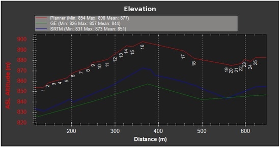 Hill flight elevation. The figure shows the elevation at the specified coordinates provided by the flight plan (25 m above ground), Google Earth (GE) and the Shuttle RADAR Topography Mission (SRTM) databases. This graph was generated with the Mission Planner Ground Control Station (GCS).