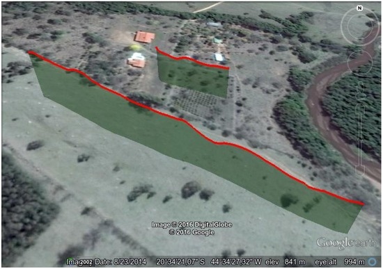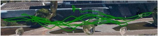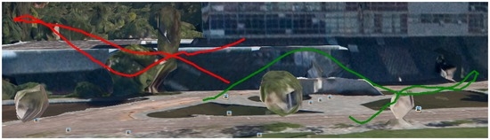 Hill flight path from GPS data of the telemetry logs. This image is from a perspective view, where the red lines represent the flight paths of the two areas of interest and the green shade the projection of this flight path on the Earth’s surface.