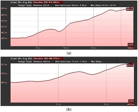 Hill flight path elevation from GPS data of the telemetry logs. The horizontal axis shows the distance the UAV has traveled, and the vertical axis represents the ASL altitude. These graphs were generated using Google Earth. (a) First part; (b) second part.