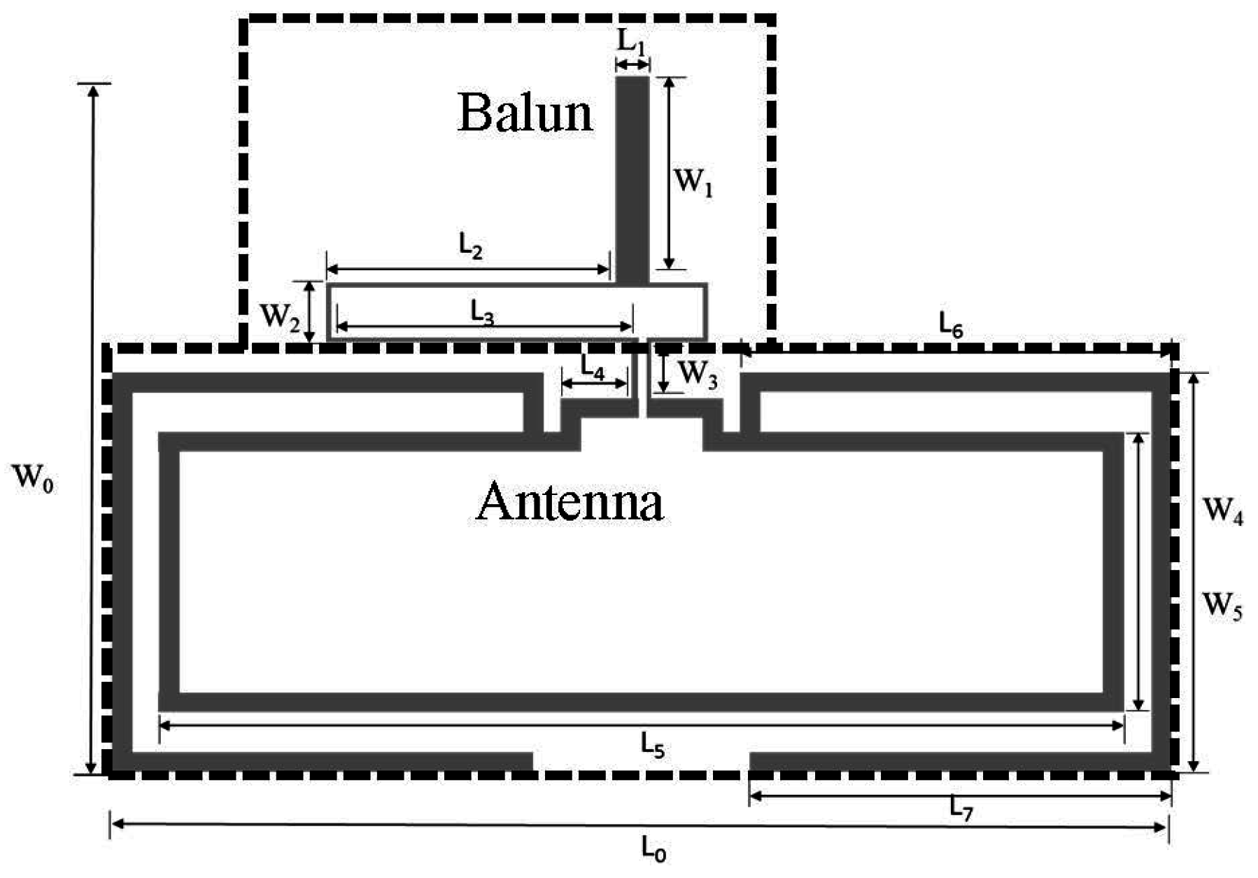 Layout of the proposed antenna fed using a balun. The wide space in the center is left intentionally for sensor integration.