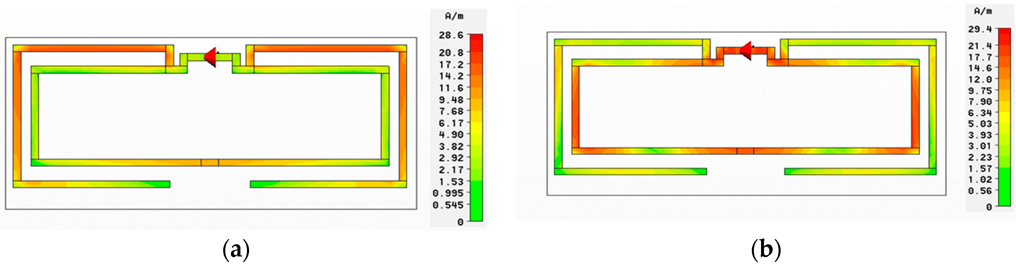 Current distribution in the two loops of the antenna. (a) Outer dipole at 2.8 GHz; (b) Inner loop at 4.6 GHz.