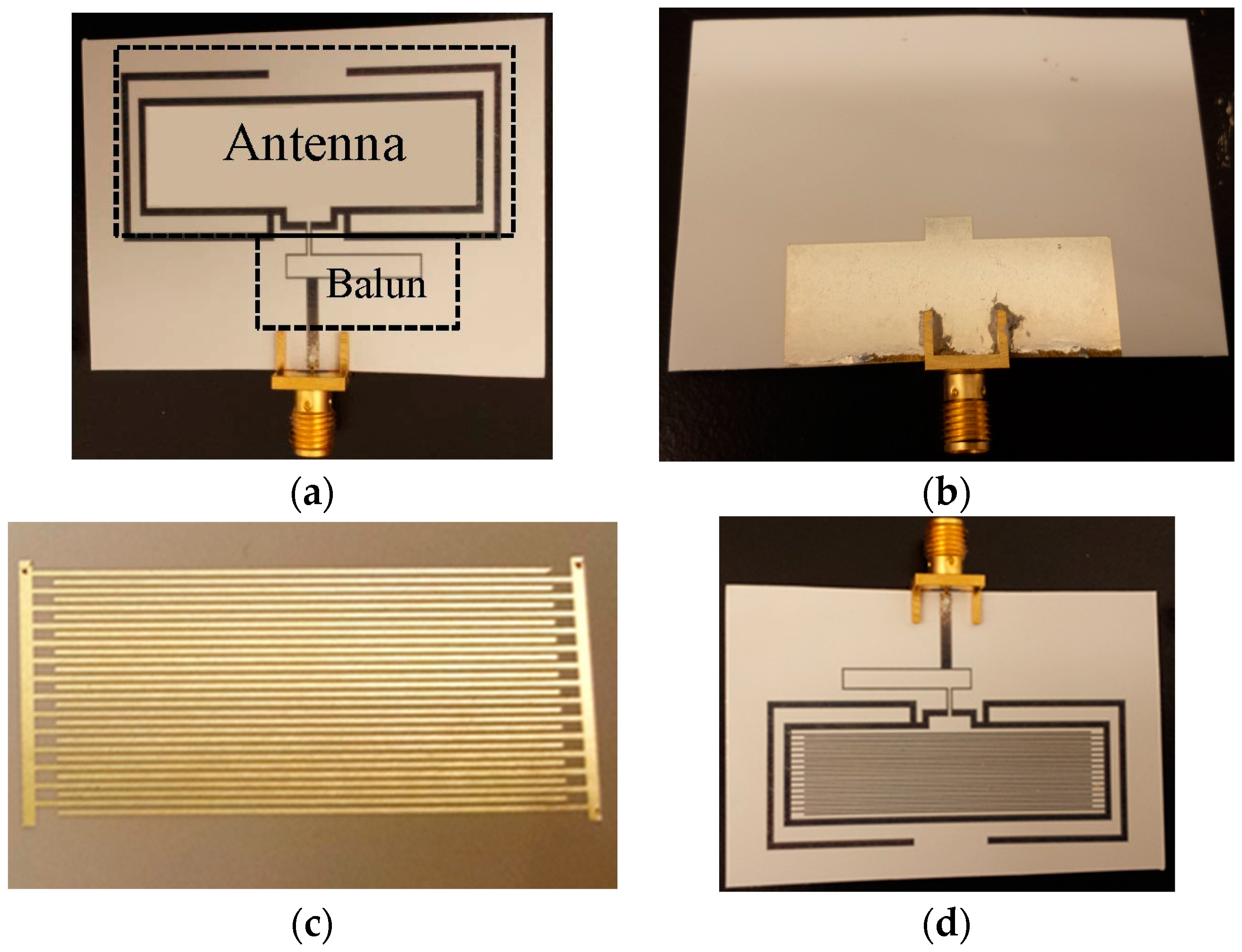 Fabricated prototypes. (a) Top view of antenna; (b) Bottom view of antenna; (c) Inkjet-printed interdigitated electrode; (d) Complete prototype with antenna, balun, and interdigitated electrode.