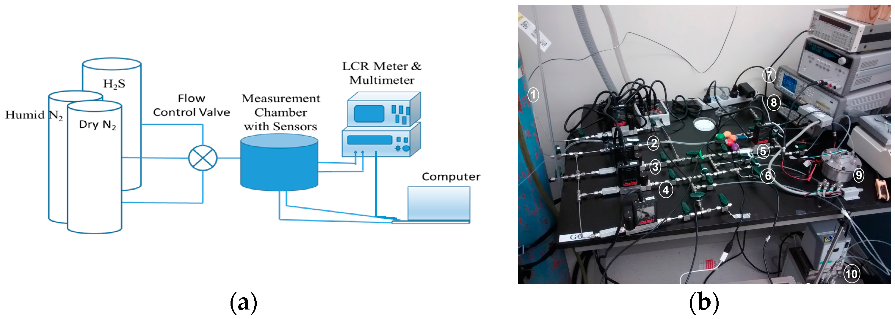 Measurement setup for humidity and gas sensing. (a) Block diagram; (b) Laboratory setup. 1. Gas cylinder. 2. MFC (Mass Flow Controller) connected to H2S gas. 3. MFC connected to dry Nitrogen. 4. Gas flow through this MFC going to bubbler. 5. MFM (Mass Flow Meter). 6. Connected to bubbler for humidity measurement. 7. LCR meter. 8. Multimeter. 9. Measurement chamber with gas inlet and gas outlet; test leads connected to LCR and Multimeter, contains sensor tag. 10. Bubbler to provide humidity.