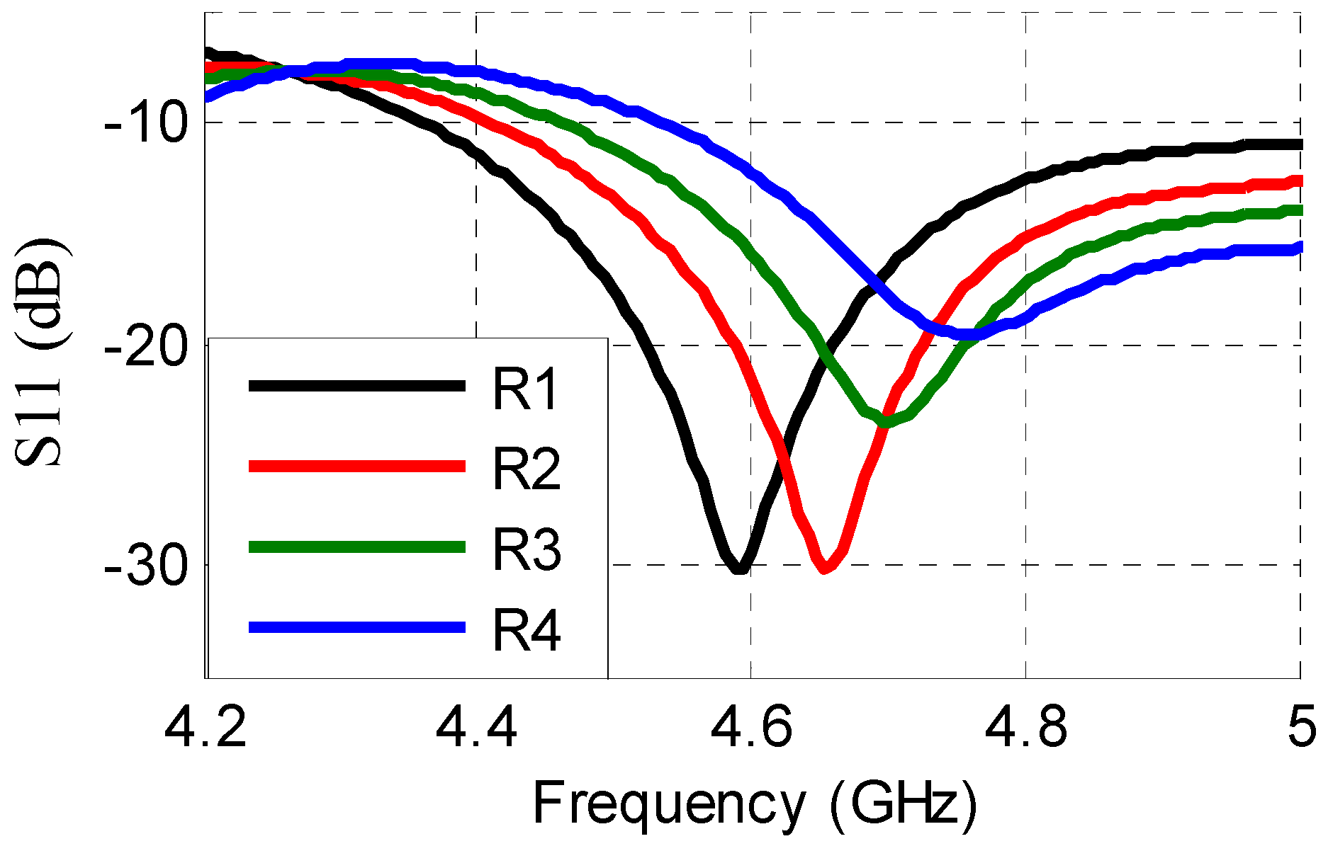 The 2.8 GHz frequency band due to the outer dipole is utilized for the tag’s chipless identification. This is achieved by creating minor changes in the dimensions L6 and L7, thereby getting varied resonances between 2.7 GHz and 2.9 GHz. Table 2 enlists dimensions of five such example tags, whereas preliminary simulation results (Figure 4) show the corresponding unique resonances. Following the same procedure and utilizing frequency shift encoding technique as presented in [21], a large number of individual tags can thus be generated.