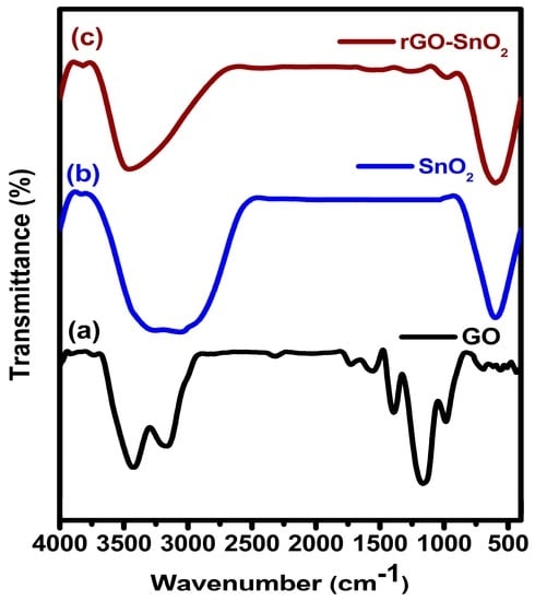 The GO, SnO2, and rGO-SnO2 were recorded in the FT-IR spectra at transmittance mode and are shown in Figure 2a–c, respectively. The peaks observed at 3453 cm−1 and 1400 cm−1, correspond to the O–H stretching of –COOH in GO and to the vibration of intercalated water, respectively; the characteristic peaks of oxygen moieties—located at 1184 cm−1, 1595 cm−1, and 1747 cm−1—correspond to C–O (ν (epoxy or alkoxy)), C=O in –COOH, and carbonyl moieties (ν (carbonyl), respectively. The GO functional groups are significantly reduced from GO-SnO2 materials. It is clearly indicated that the GO is partially reduced to graphene. Moreover, the new peak (Figure 2b) appeared at 597 cm−1, is attributed to the Sn–O stretching. From this spectrum, it is clear that the rGO-SnO2 peak intensities are similar to the ones of the SnO2 sample. The above facts enunciate the possible compact chemical bonding between SnO2 and rGO, which may be due to the unique synthetic approach.