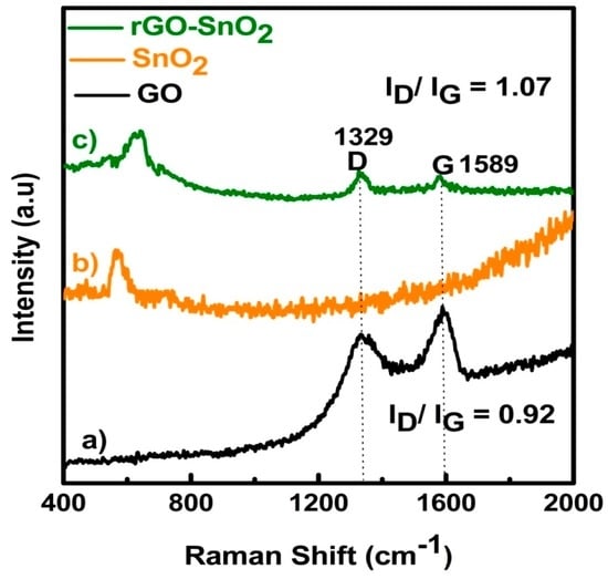 In Figure 4, the Raman spectra of GO (a), SnO2 (b), and rGO-SnO2 (c) are plotted respectively. The observed Raman peak shift at 576 and 630 cm−1, in Figure 4b,c, respectively, indicates the presence of SnO2 [23]. Additionally, in the rGO-SnO2 spectrum, the peaks at 1329 and 1589 cm−1 correspond to the D and G band of GO. Previous reports have shown that the D band always appears whether any form of disorders and defects are present; e.g., vacancies, grain boundaries, and amorphous carbon species in carbon materials. The G band is usually generated by the stretching of all sp2 atoms in carbon rings or carbon chains (E2g photons of sp2 atoms). Namely, the ID/IG intensity ratio is closely related with the concentration of defects and with the average size of the p-conjugation in carbon materials. Reasonably, the D band will disappear gradually when the GO is reduced for defect decrease. In the present work, the ID/IG ratios are 0.92 for GO and 1.07 for rGO-SnO2 [24], respectively. Therefore, the existence of SnO2 in rGO results in more defects, as well as in the destruction of sp2 domains. From another point of view, this change also suggests an interesting connection between the SnO2 nanoparticles (NPs) and rGO [25].