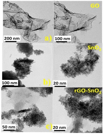 TEM image for (a) GO; (b) SnO2; (c) rGO-SnO2.