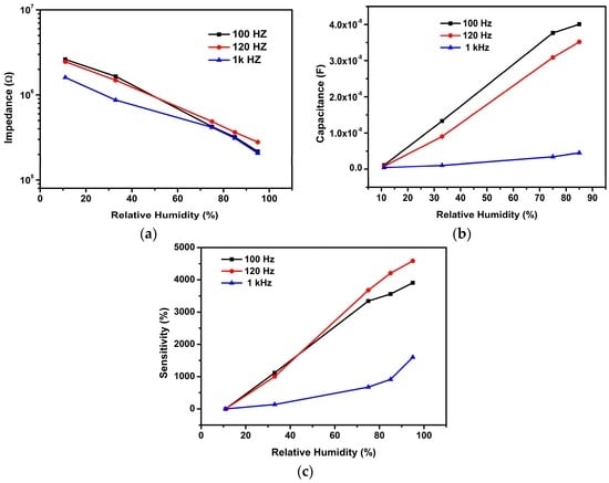 (a) The dependence of impedance on the RH for the rGO-SnO2 sensor measured at various frequencies; (b) The dependence of capacitance on the RH for the rGO-SnO2 sensor measured at various frequencies; (c) The sensitivity of the rGO-SnO2 sensor for different tested RH and frequencies.