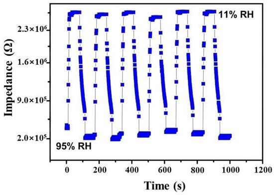 The impedance modulus variation of the rGO-SnO2 sensor for four consecutive cycles of the above described process of water adsorption and desorption is shown in Figure 7. The observed response time is 10 s, while the recovery time is 60 s. The response and recovery properties are consistent with the low humidity hysteresis exhibited by the sensor [32,37]. Comparison of response and recovery times between the proposed sensor and other sensors reported in the literature is given in Table 1.
