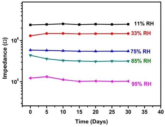 To test the long-term stability at high humidity, the rGO-SnO2 sensor was placed in the glass container with 95% RH and the impedance measurements were repeated every five days over a period of 30 days. As shown in Figure 8, a slight variation in impedance was observed with the passage of time, proving that the rGO-SnO2 sensor has good stability and durability at high humidity. This is highly probably due to the cross-linked porous framework of the rGO-SnO2 [50], which could effectively prevent the composites from dissolving in the adsorbed water and immobilize the functional molecules (rGO) in the pores.