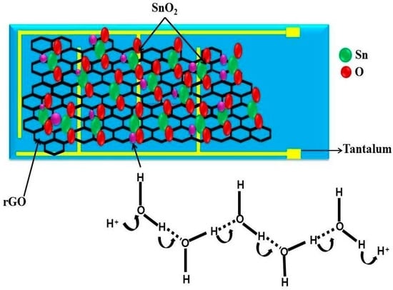 The schematic of the proposed humidity sensing mechanism of the rGO-SnO2 nanocomposite.